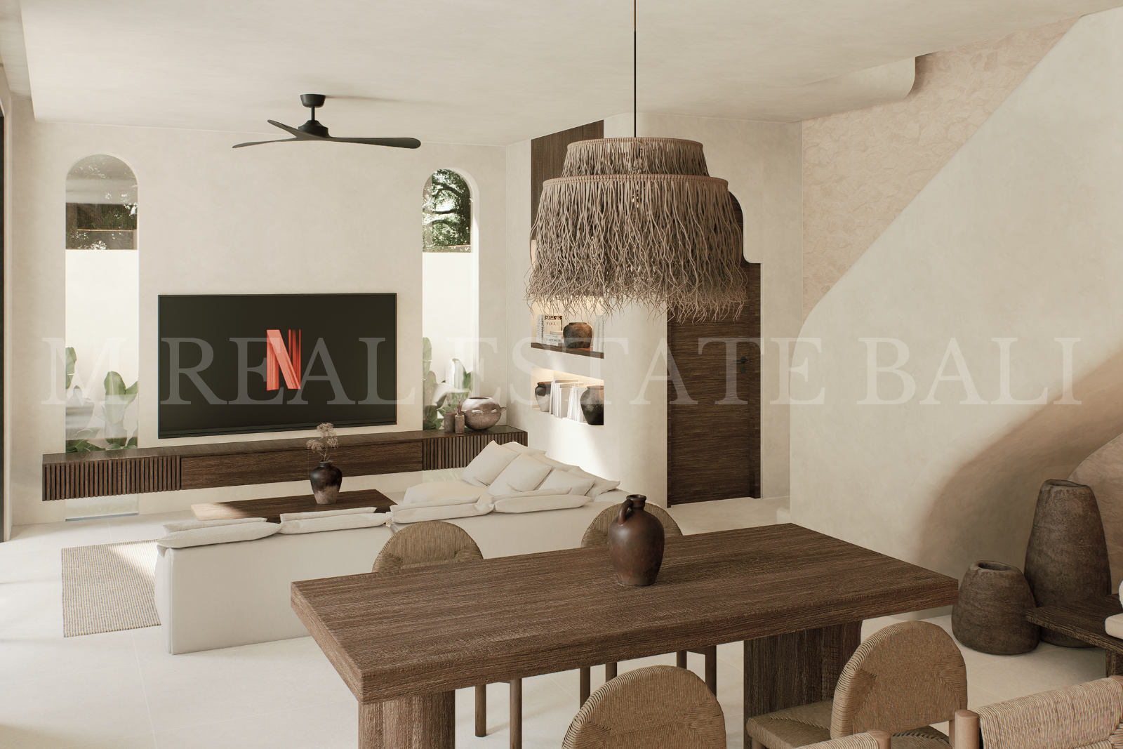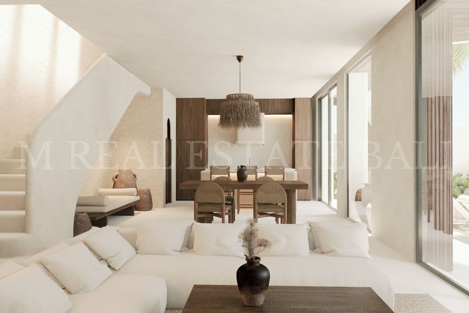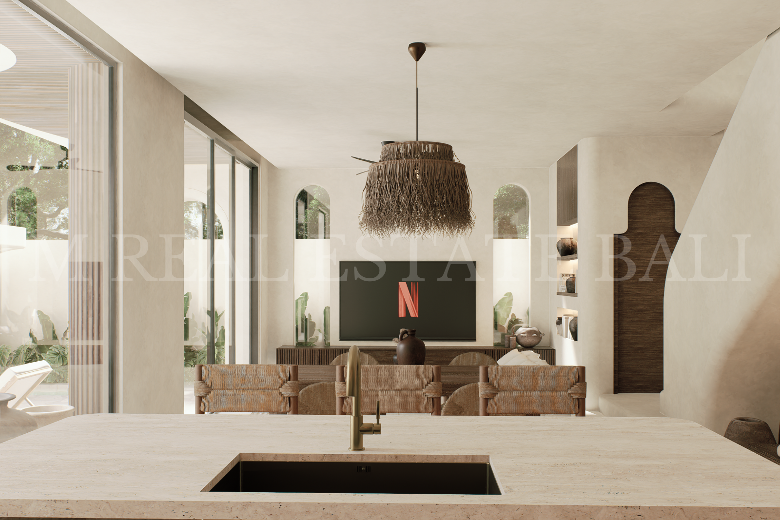 Open-Plan Kitchen, Dining & Living Area: A contemporary open-plan layout combines a fully equipped kitchen with a central island, dining area, and living room. Large openings create a seamless indoor–outdoor flow while maximising natural light and surrounding views.