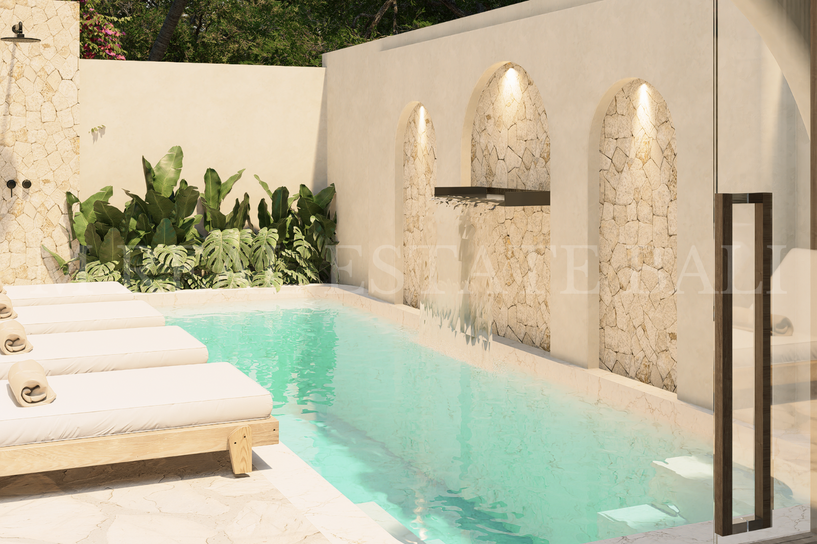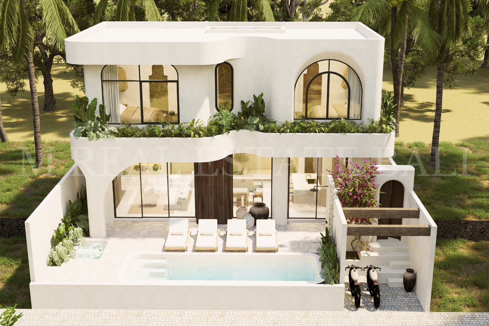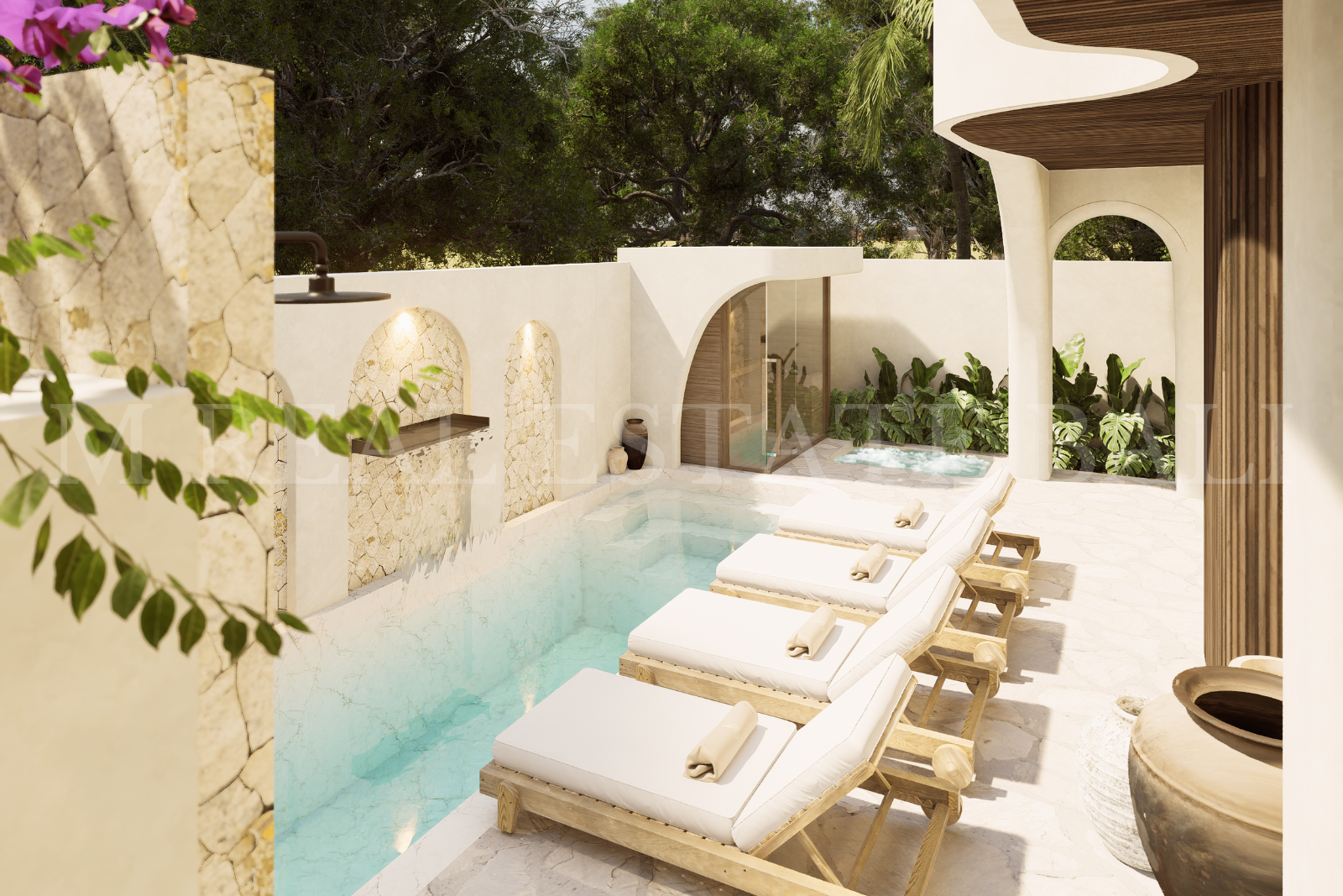 Private Pool, Pool Deck & Tropical Garden: Enjoy a private swimming pool with a dedicated pool deck surrounded by lush tropical landscaping, creating a peaceful outdoor living environment.