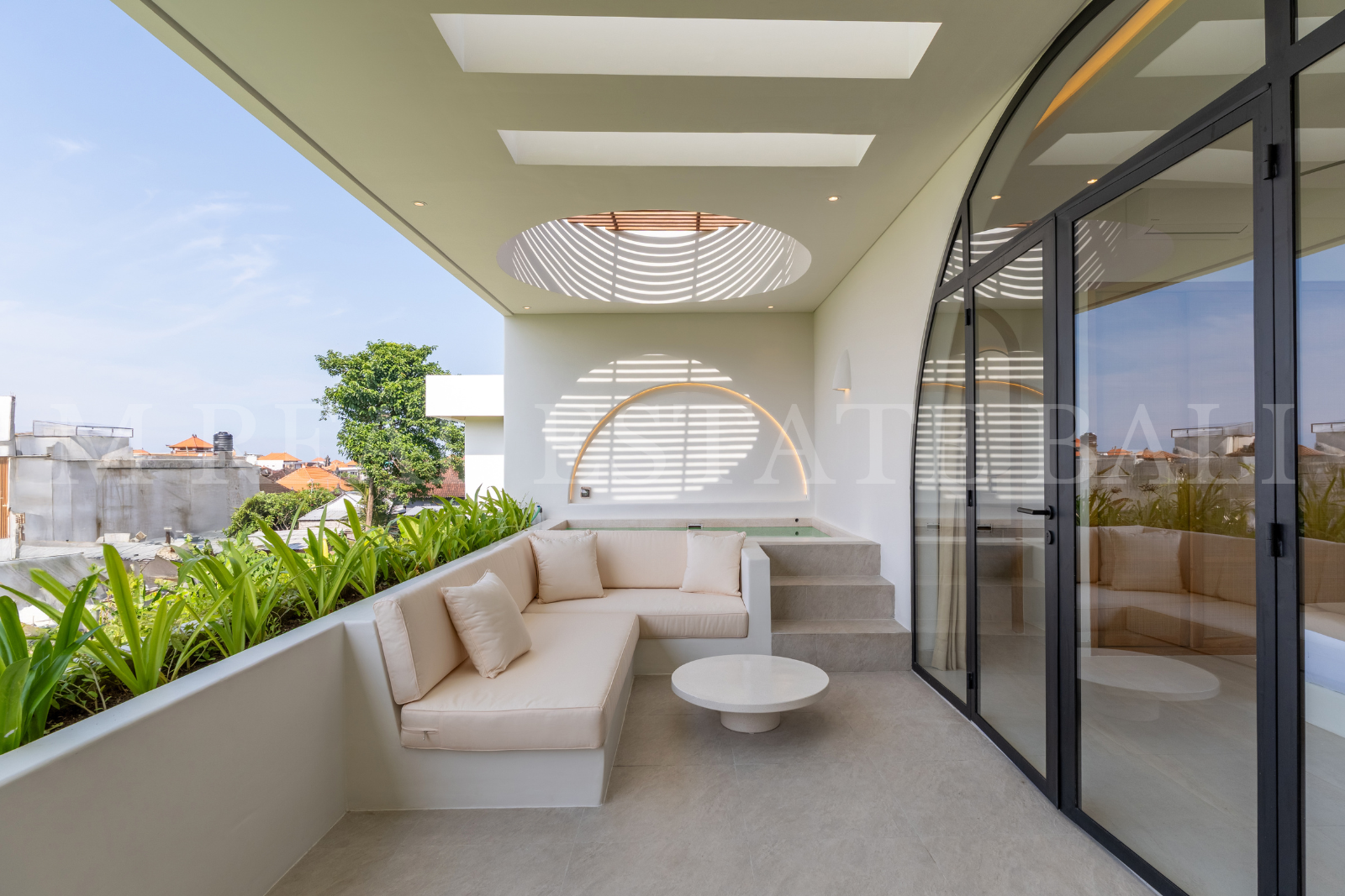 An inviting outdoor sunken lounge sits within a large landscaped garden, ideal for relaxing, hosting guests, or enjoying quiet evenings under the stars.Rooftop Terrace with Jacuzzi: