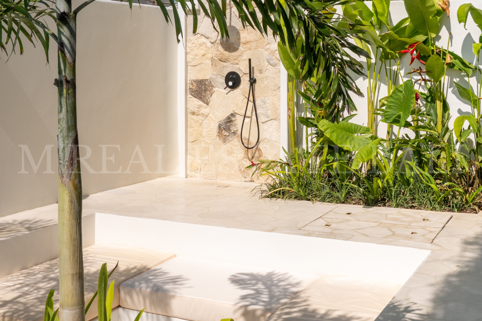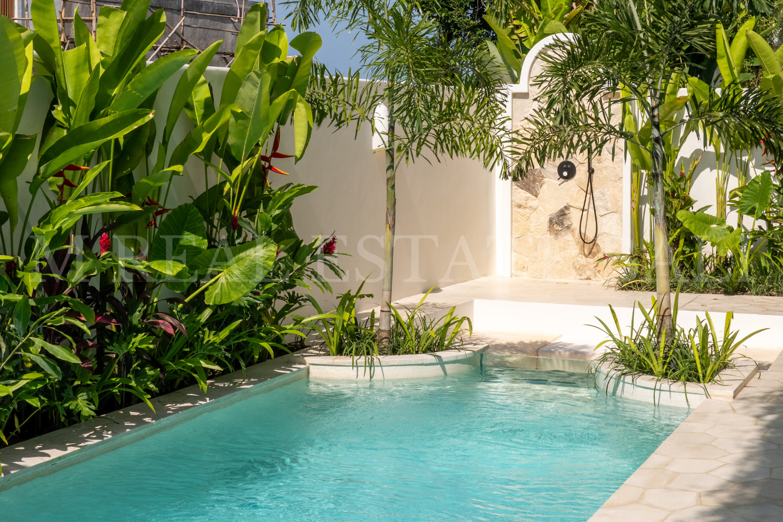A beautifully designed pool with a sunbathing deck and refreshing outdoor shower creates a serene tropical oasis.Outdoor Sunken Seating & Tropical Garden: