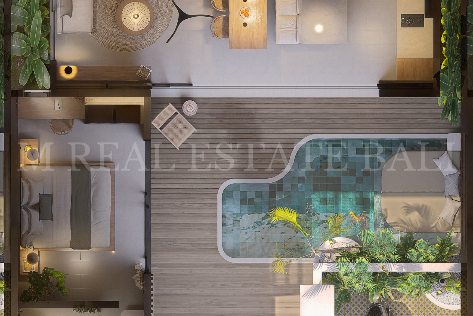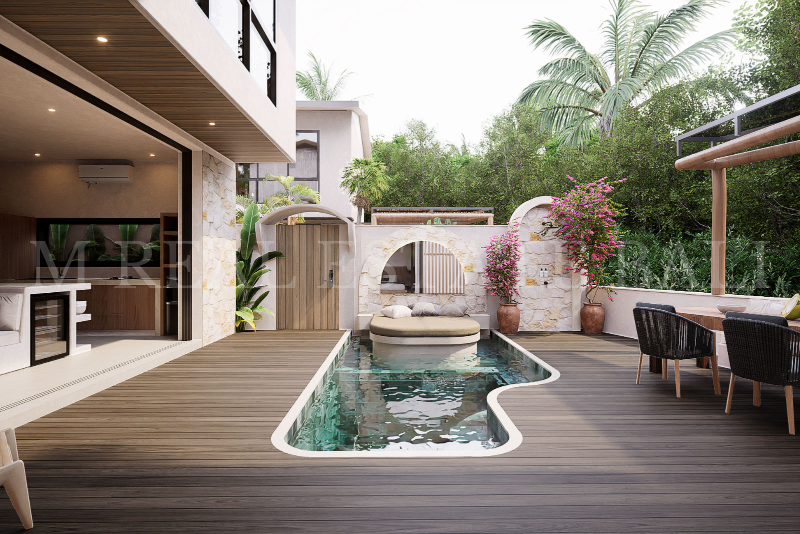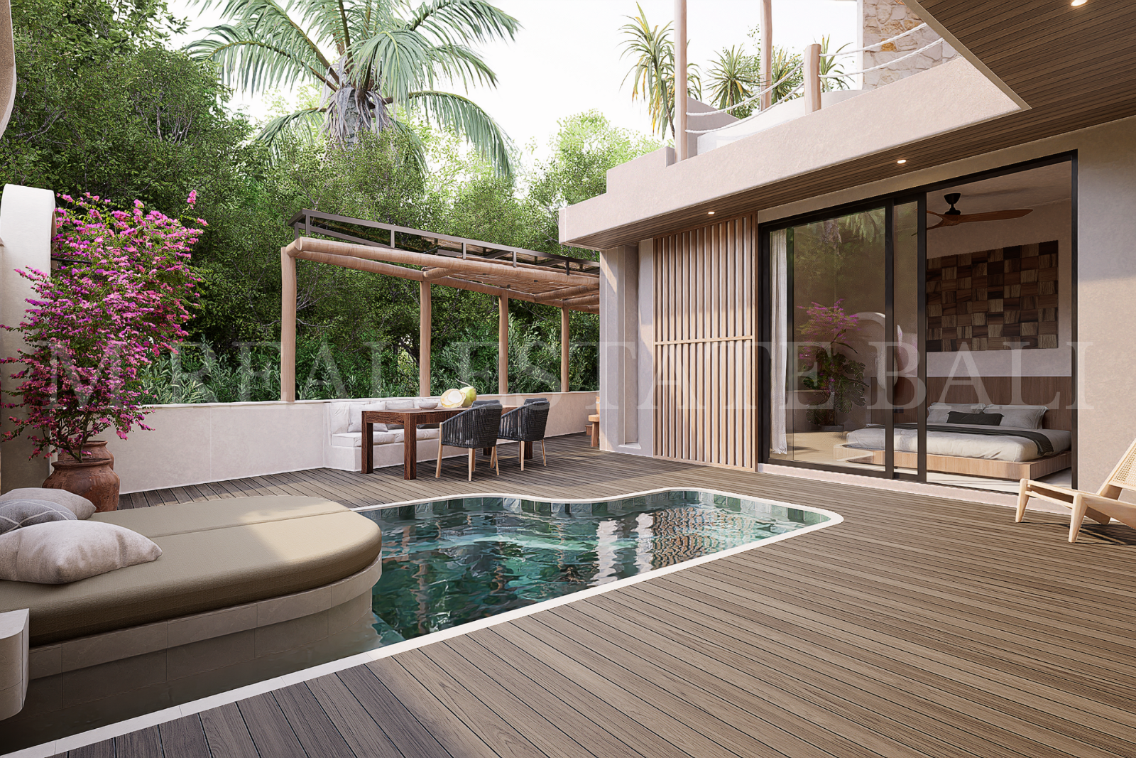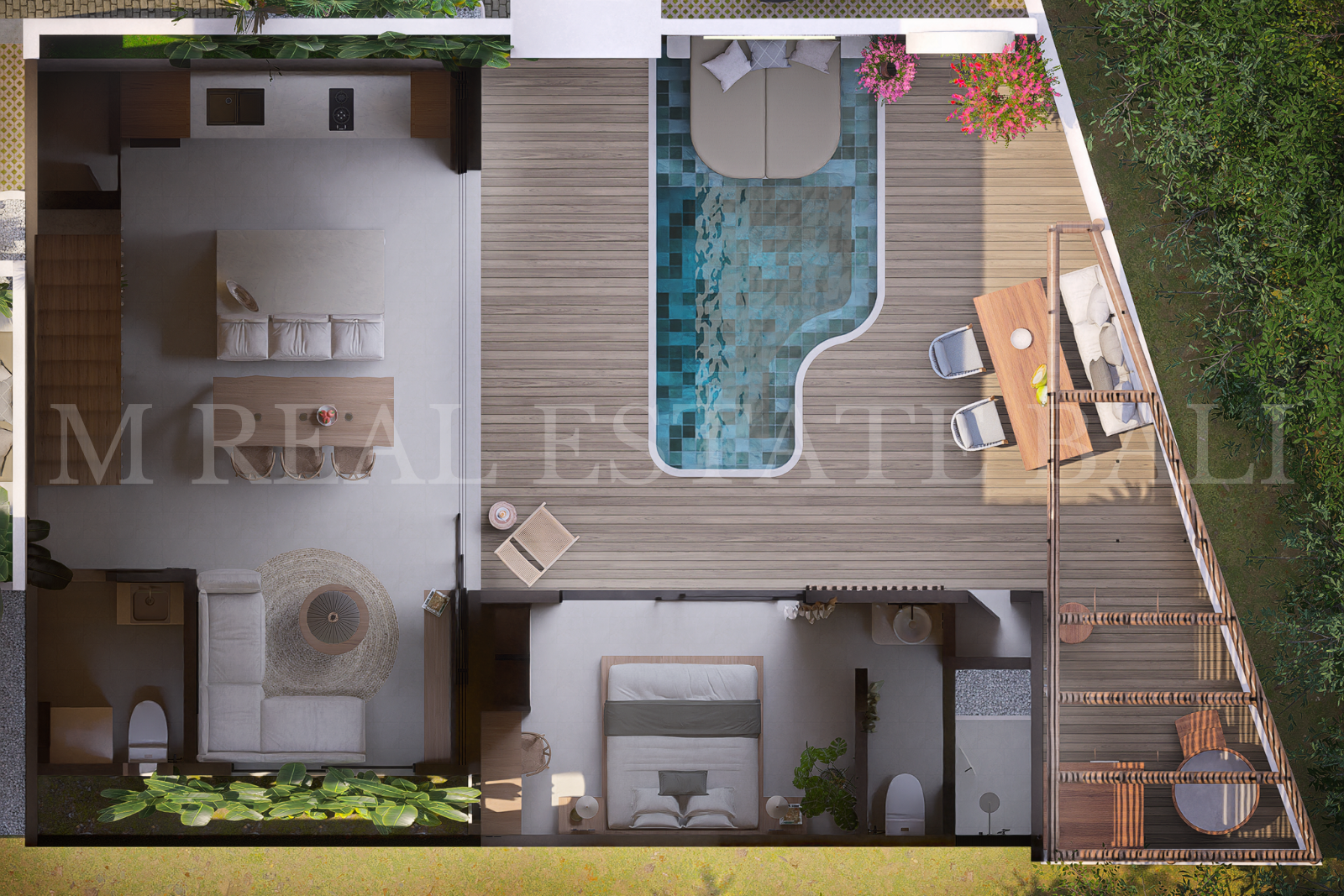 Private Pool & Tropical Outdoor Space: Enjoy your own private swimming pool, complete with a pool deck and lush tropical garden, offering a tranquil setting that blends indoor and outdoor living.