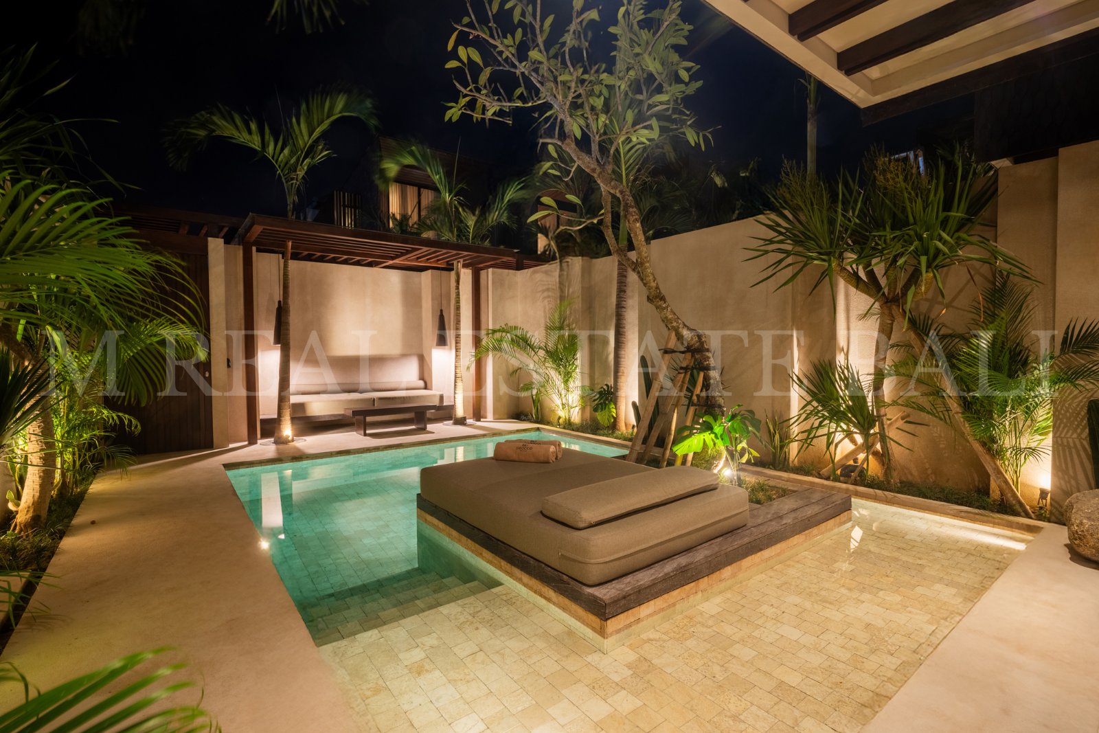 Private Swimming Pool with Garden: A private swimming pool set within a lush garden and seating area offers a peaceful tropical escape.