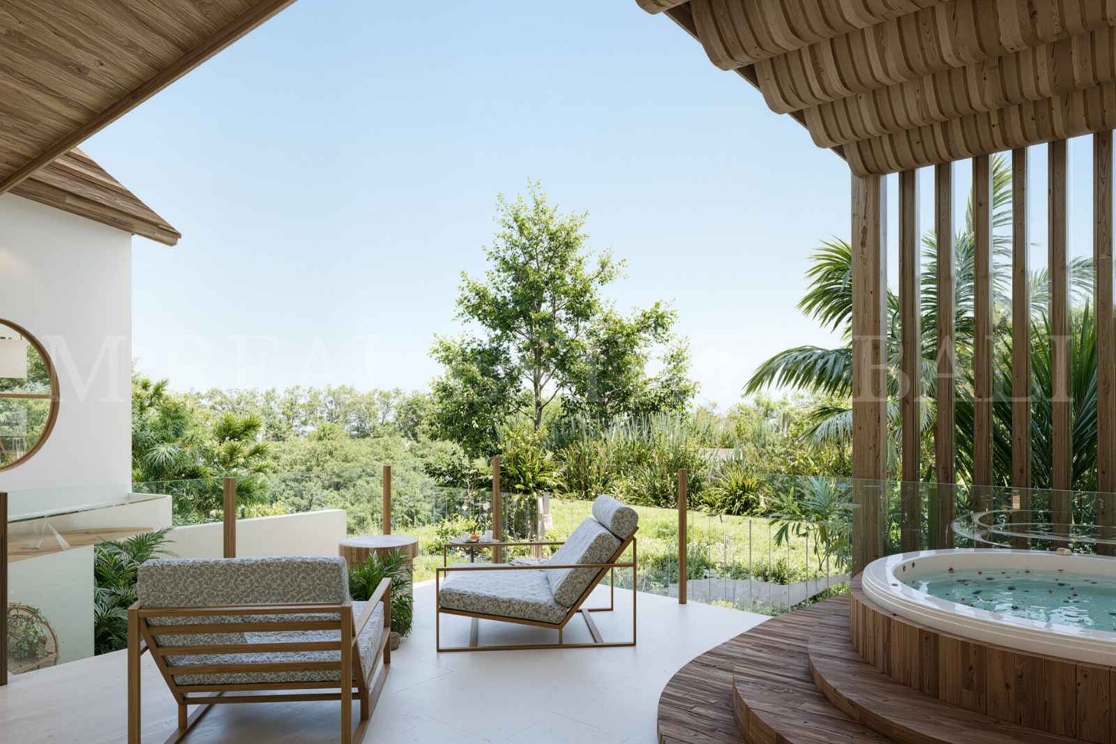 Three Spacious Bedrooms with En-Suite Bathrooms: The villa features three generously sized bedrooms, each with an en-suite bathroom. The master bedroom includes a bathtub and private balcony, offering a serene retreat with elevated views.