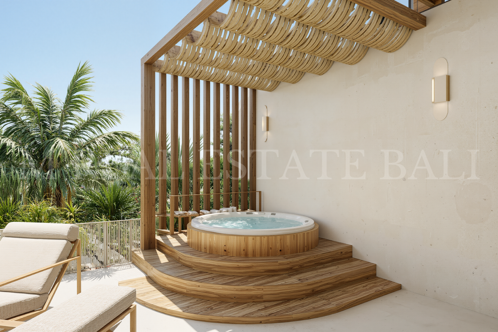 Second-Floor Terrace with Jacuzzi & Rice Field Views: The second-floor terrace features a seating area and a private jacuzzi, offering beautiful open views over the surrounding rice fields — an ideal space for relaxation and sunset moments.