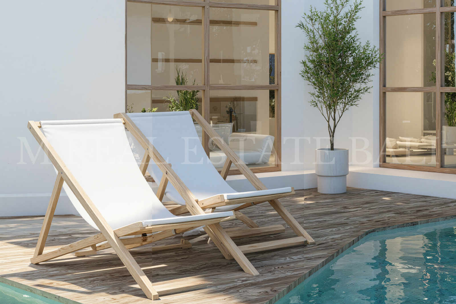 Pool Deck & Tropical Garden: A spacious pool deck with sunbeds, surrounded by a lush tropical garden, creates a calm and inviting outdoor environment.