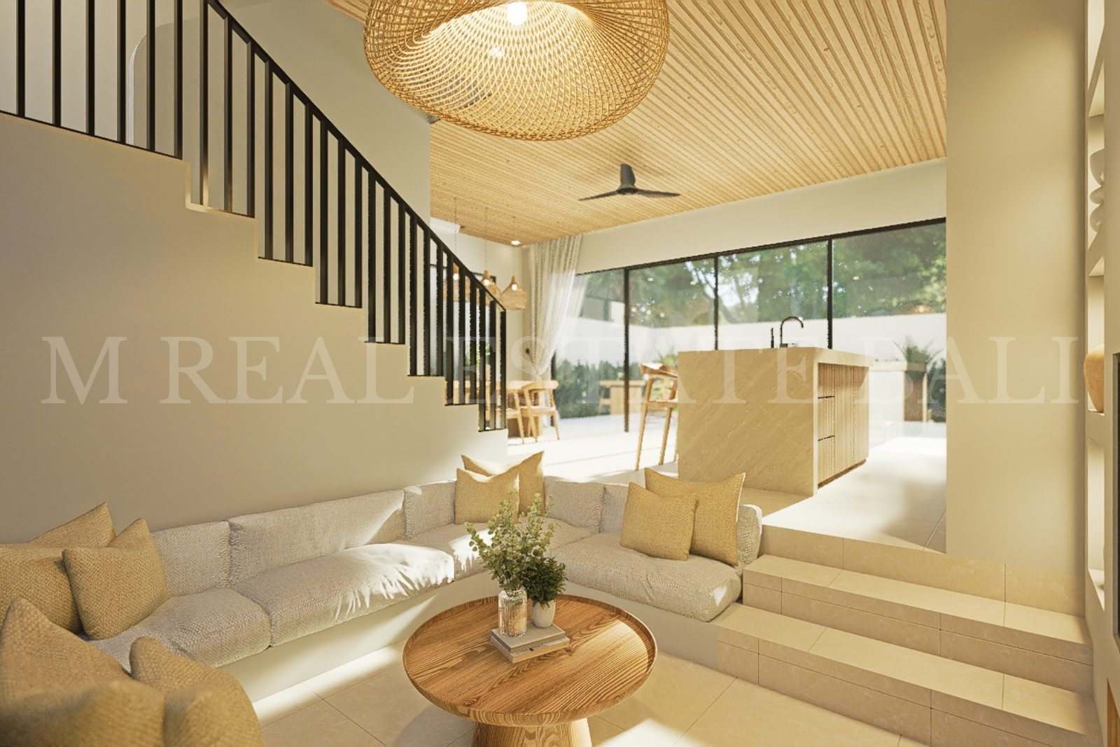 Open-Plan Living with Sunken Lounge: A well-designed open-plan layout connects the fully equipped kitchen with a central island to the dining area and living room, complete with a sunken sofa that adds both character and comfort to the space.