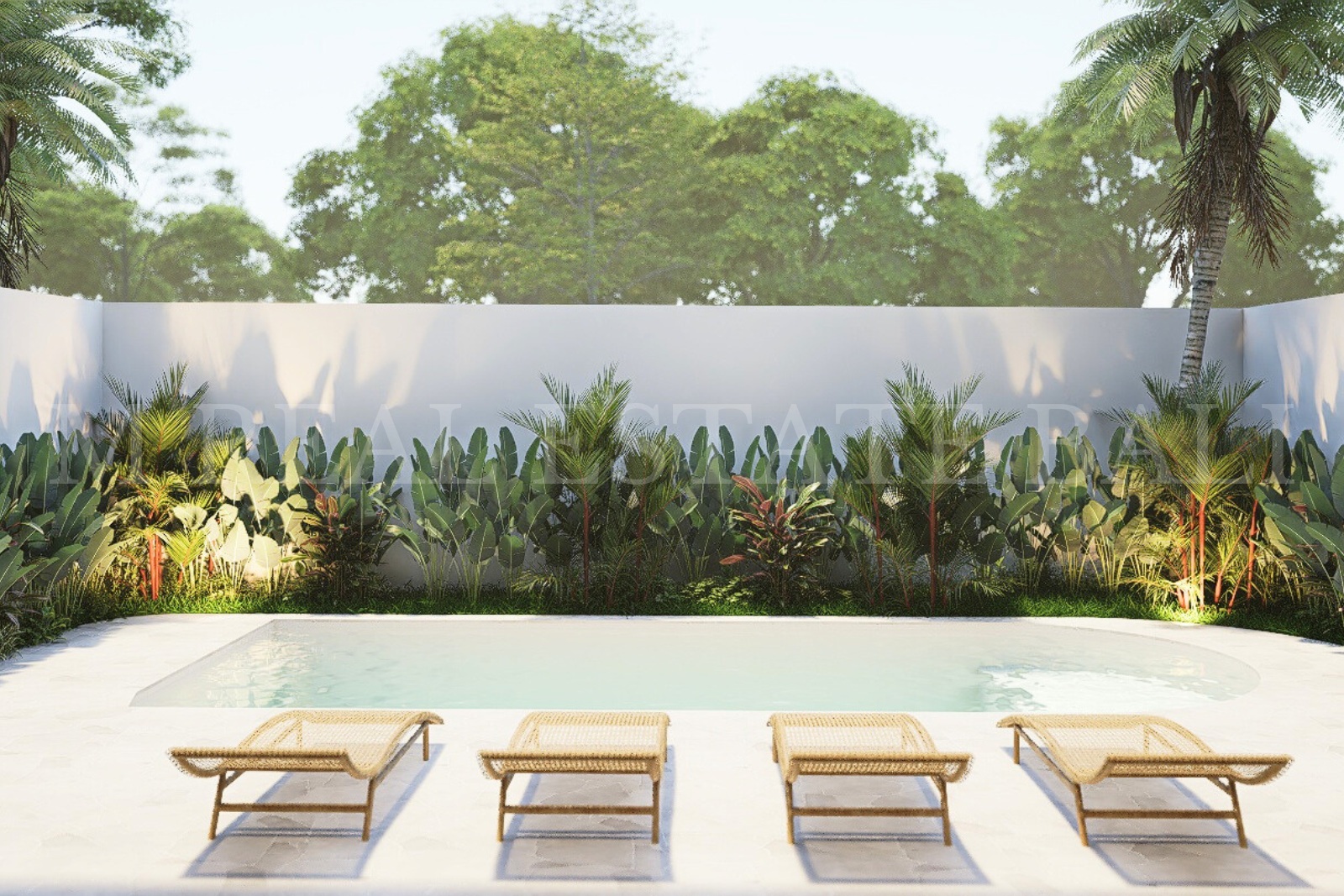 Shallow Pool Deck & Tropical Garden: A shallow pool deck with sunbeds, surrounded by a lush tropical garden, provides an inviting space for relaxation and outdoor enjoyment.